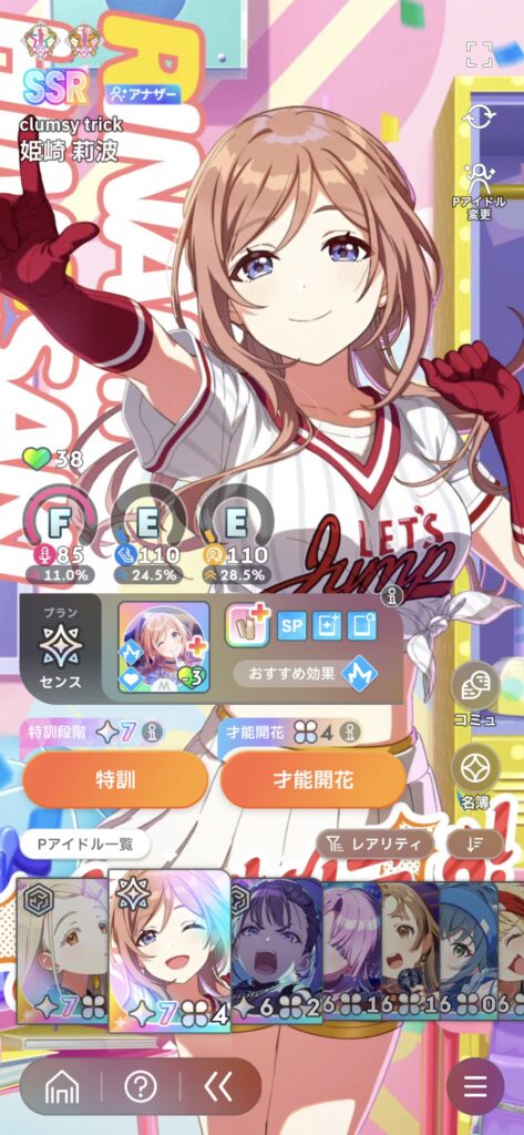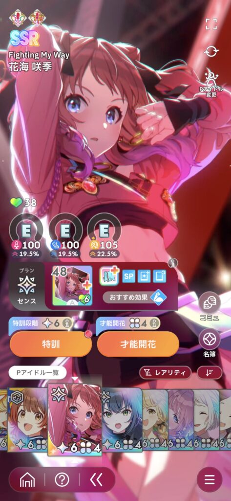 アイドルは「ボーカル(Vo)・ダンス(Da)・ビジュアル(Vi)」のパラメータとそれぞれのレッスンボーナス、更に固有スキル・Pアイテムとプロデュースプランを持っています。上の咲希でもいいんですが、せっかくなので莉波で解説。