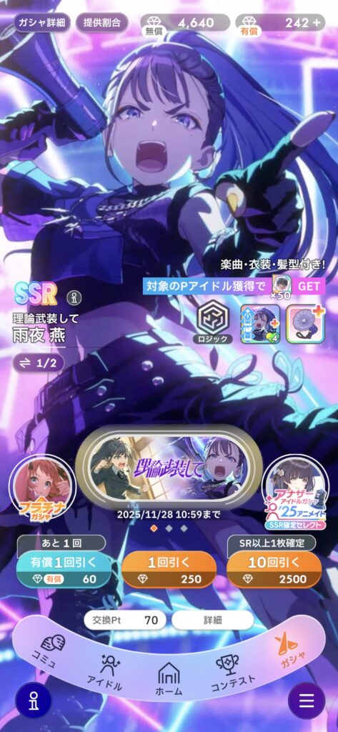 ガシャ(いわゆるガチャ。バンナム系では「ガシャ」と呼びます)は、「ジュエル」がないと引けません。プラチナガシャといういつでも引ける恒常ガシャと、イベント期間中に引けるガシャ(のちのち恒常に追加されるものと、年に1回程度しか引けない限定ガシャ)があります。いずれも1回250ジュエルで、1日1回だけ60ジュエルで引けます。10連ガシャなら2,500ジュエルでSR以上が1枚確定です。ただ、このゲームにはプロデュース時に使う「サポートカード」というものがあり、アイドルガシャにサポートカードも混じっていますので、必ずしもアイドルのSRが出るとは限りません。