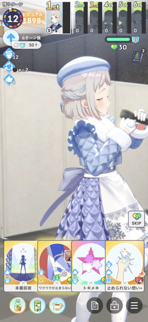 上記はオーディション画面です。こんな風にデッキ内から下にスキルカードが出てきますので、カードを選んで最終ターンまでにスコアを出します。細かい画面説明はしません。